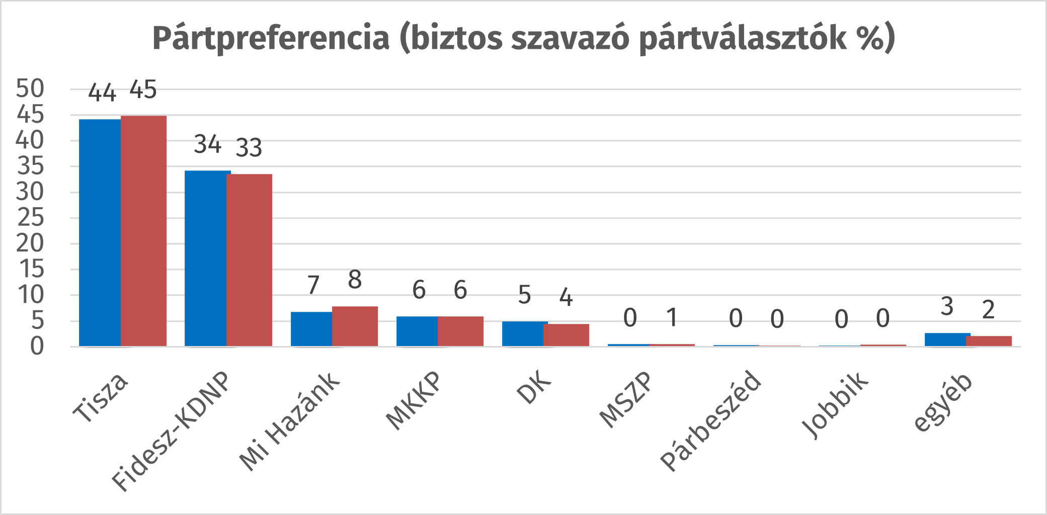 - Októberben 6 százalékponttal vezet a Tisza Párt a Fidesz-KDNP előtt a teljes népességben, 30 százalék szavazna Magyar Péter pártjára. A pártválasztók körében 2 százalékpontot erősödött a Tisza, így az előnye kormánypártokkal szemben immár 8 százalékpont, az állás 43-35. A biztos szavazó pártválasztók 44 százaléka szavazna a Tiszára, 34 százaléku...